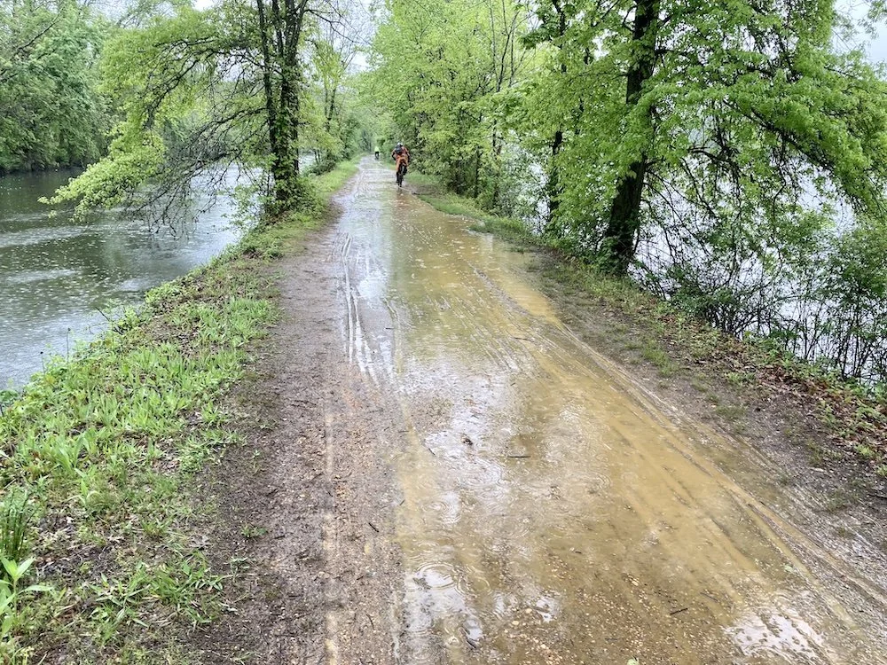 …which was great at first, a serene jaunt along a canal, lush with overhanging trees and flecked with ducks, geese, turtles, and heron. But then it started to rain, lightly, then more heavily. I normally avoid riding in the rain—as long as it’s not too cold, the experience itself is not unpleasant, but you usually don’t want to arrive where you’re going soaking wet. Today, though, I knew there was a warm, dry hotel room at the end of the trail, so getting soaked was kind of fun. There were just two drawbacks: 1) You had to ride slowly and carefully through and around slippery lagoons that sometimes spanned the trail side to side; 2) The bike I rode in 2020 had fenders, but I had so far neglected to put them on this, my former guest bike. Which meant my rear wheel kicked up watery mud that splattered my bike and my person until we were a thickly daubed, brown, sticky mess.